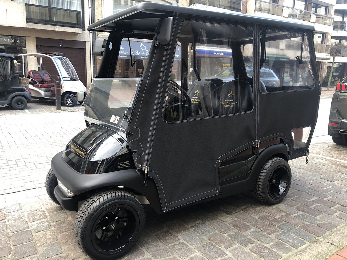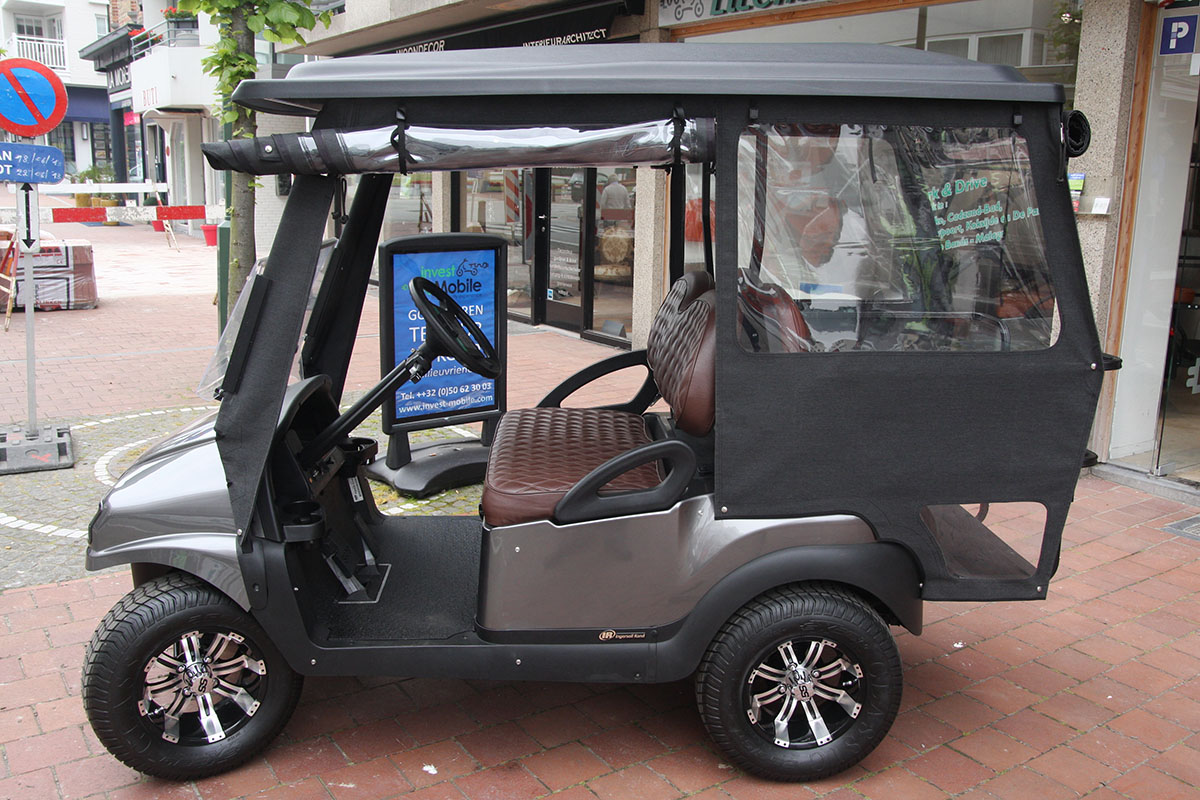 Met de golfkarren van Invest-Mobile is rijden op de openbare weg geen enkel probleem. Wij, als grootste leverancier van golfkarren in de Benelux en Duitsland, gaan nog een stap verder dan alleen het bevestigen van een kenteken en originele boordpapieren bij uw golfkar. Onze golfkarren voldoen aan alle Europese vereisten voor het rijden op de openbare weg. Een veilige kooiconstructie, verlichting, gordels, spiegels en claxon worden door ons gemonteerd. Ook aan een veiligheidsopstap aan de achterzijde en een “parkeerticket”-module is gedacht. Standaard. Zonder zorgen. En dus veilig rijden op de openbare weg!