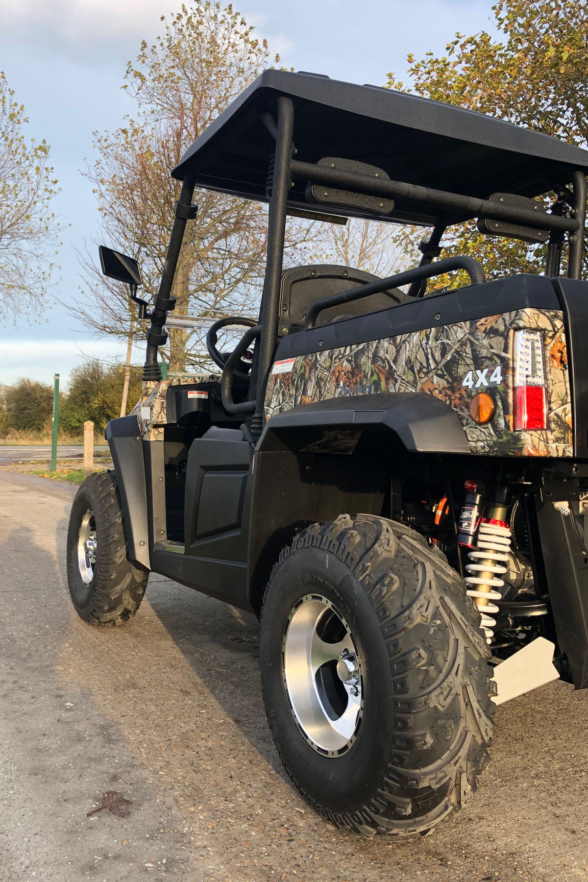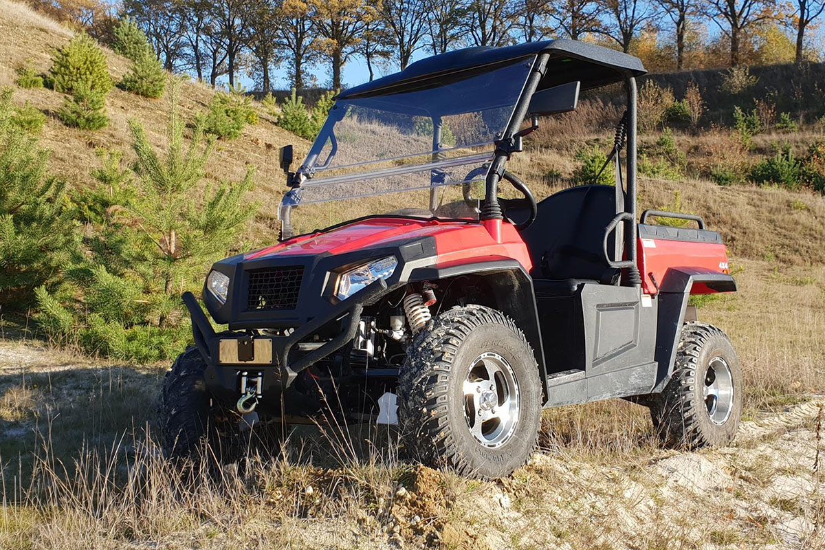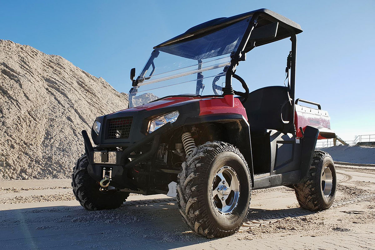 Für eine energieeffiziente Fahrt kann auch der 2-Rad-Antrieb zugeschaltet werden. Die 4×4-Antriebseinstellung unseres elektrischen Golfwagens mit ‚öffentlicher Straßenzulassung‘ sorgt dafür, dass Sie auch die unbefestigten Straßen problemlos erreichen können.